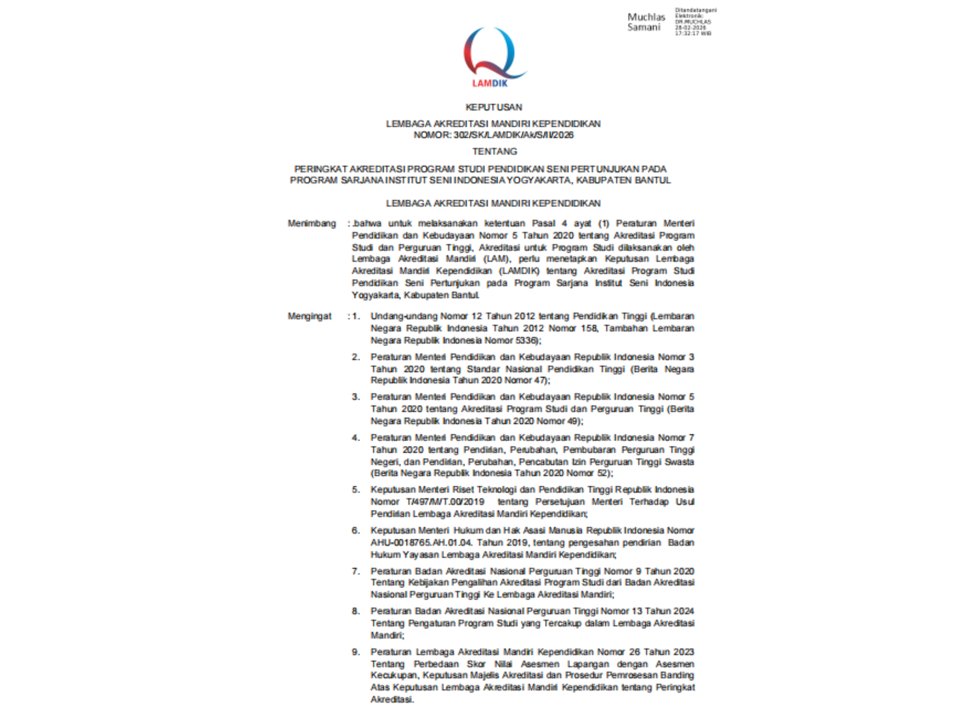 Yogyakarta, 3 Maret 2026 – Institut Seni Indonesia (ISI) Yogyakarta kembali meneguhkan reputasinya sebagai perguruan tinggi seni terkemuka di Indonesia. Program Studi Pendidikan Seni Pertunjukan pada Program Sarjana resmi meraih