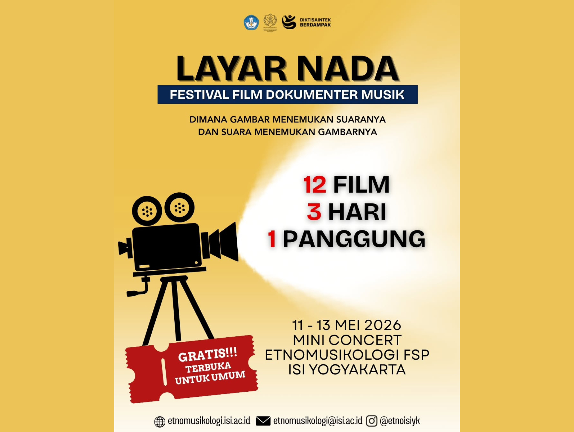 YOGYAKARTA, 24 April 2026 — Program Studi Etnomusikologi, Fakultas Seni Pertunjukan, Institut Seni Indonesia Yogyakarta menghadirkan “Layar Nada — Festival Film Dokumenter Musik” pada 11–13 Mei 2026 di Mini Concert