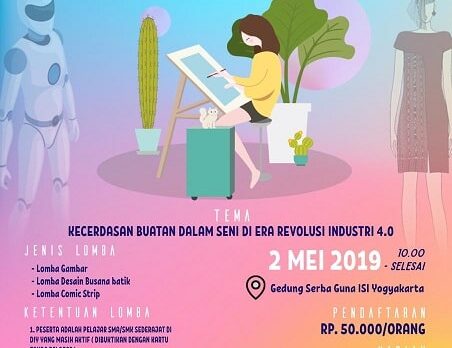 Pada hari Kamis, 2 Mei 2019, pukul 10.00 WIB bertempat di Gedung Serbaguna ISI Yogyakarta telah diselenggarakan Lomba Seni Rupa yang merupakan salah satu agenda dalam rangka Dies Natalis XXXV Lustrum VII ISI Yogyaakrta dengan tema “Kecerdasan buatan dalam seni di era revolusi   Industri 4.0”. Kegiatan tersebut diikuti oleh siswa-siswi tingkat SMU/SMK se-DIY. Kurang lebih 100 peserta yang hadir pada kegiatan tersebut. kegiatan tersebut dibuka oleh Rektor ISI Yogyakarta (Prof. Dr. M. Agus Burhan, M.Hum.), dalam sambutannya Rektor ISI Yogyakarta menyampaikan keada peserta lomba seni rupa, supaya melalui lomba ini diharapkan para peserta dapat mengembangkan hobby dan kedepannya diharapkan dapat menjadikan profesi.