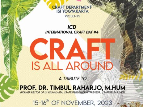Jurusan Kriya, Fakultas Seni Rupa (FSR) ISI Yogyakarta akan menyelenggarakan International Craft Day (ICD) #4 pada 15 – 16 November 2023, bertempat di Gedung Sasana Ajiyasa, FSR ISI Yogyakarta, pukul 09.00 sampai dengan selesai setiap harinya. International Craft Day (ICD) #4, 2023 bertajuk Craft is All Around beragendakan Pameran, Fashion Show, Sharing Session, Guest Lecture serta Launching buku Kriya dalam Multi Perspektif.