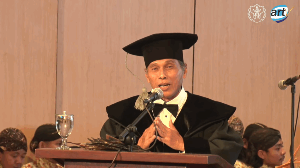 Sementara itu, Prof. Dr. Junaidi, S.Kar., M.Hum., dalam orasi ilmiah berjudul “Wayang Kulit Purwa untuk Manusia Multiusia”, memaparkan hasil penelitian yang dikembangkannya sejak tahun 1988 hingga kini. Ia mengangkat gagasan bahwa seni pedalangan dapat menjadi media pendidikan, hiburan, dan pembentukan karakter lintas usia.