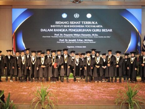 YOGYAKARTA — Institut Seni Indonesia (ISI) Yogyakarta kembali menambah jajaran guru besarnya melalui Sidang Senat Terbuka yang digelar di Concert Hall ISI Yogyakarta, Selasa (14/10/2025). Dua akademisi resmi dikukuhkan sebagai Guru Besar, yakni Prof. Dr. Prayanto Widyo Harsanto, M.Sn. di bidang Desain Komunikasi Visual dan Prof. Dr. Junaidi, S.Kar., M.Hum. di bidang Pedalangan. Keduanya menyampaikan orasi ilmiah yang mencerminkan kekuatan riset dan refleksi mendalam terhadap tantangan seni, desain, dan kebudayaan masa kini.