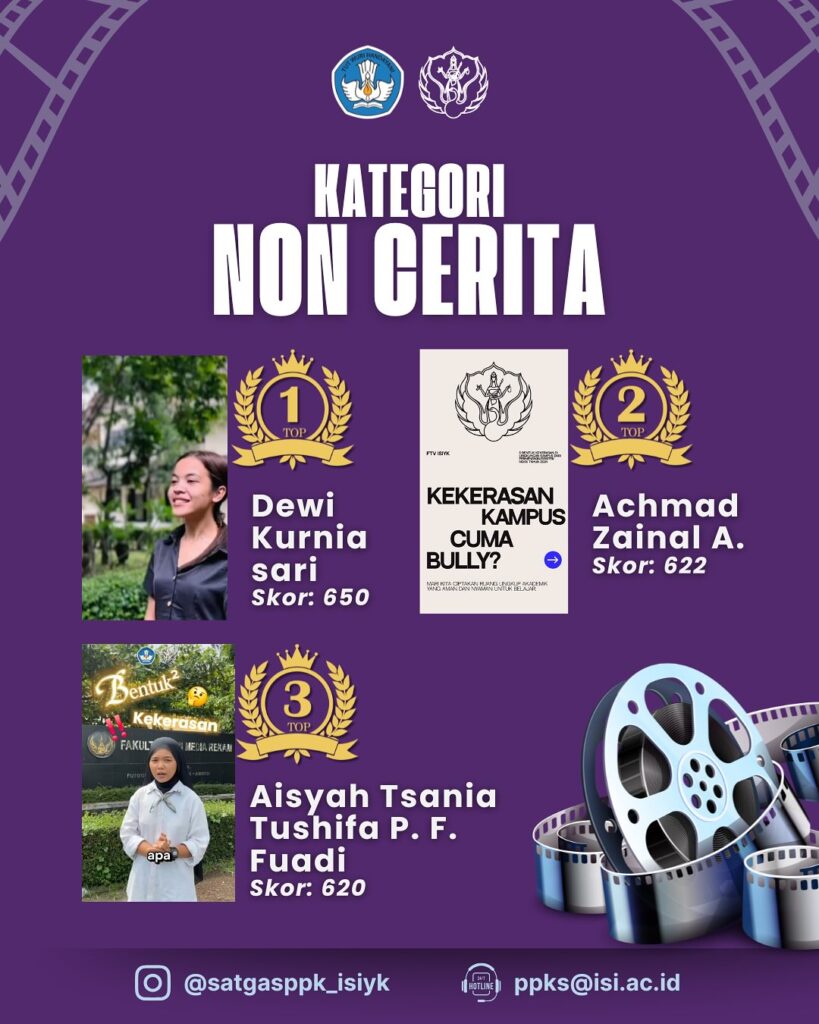 Pengumuman dilakukan melalui unggahan resmi akun Instagram ISI Yogyakarta, yang turut menyampaikan apresiasi kepada seluruh peserta yang telah berpartisipasi. Para peserta dinilai berhasil menghadirkan berbagai karya kreatif dan edukatif yang mengangkat isu pencegahan kekerasan, khususnya kekerasan seksual dan pelecehan di lingkungan kampus.