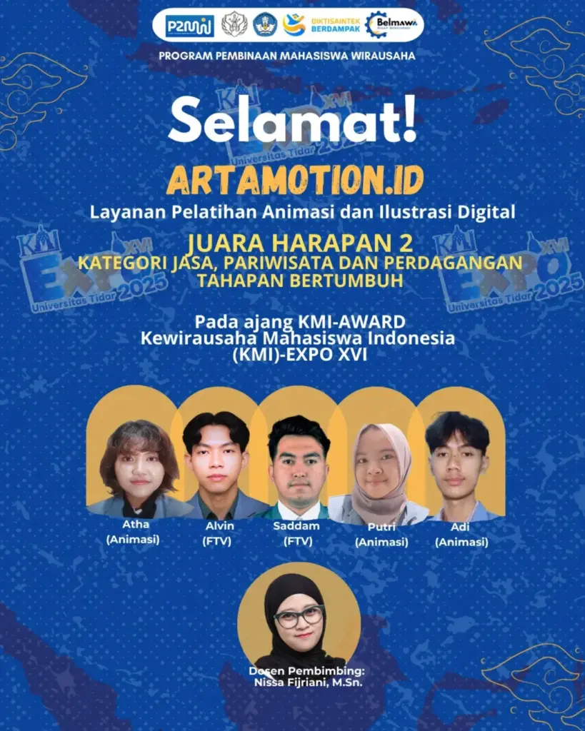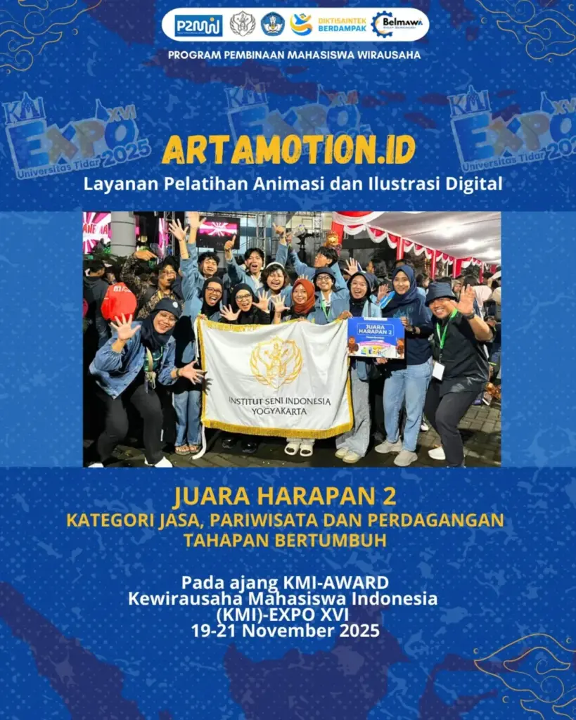 Magelang, 24 November 2025 — Tim usaha Artamotion.id, yang bergerak di bidang pelatihan animasi dan ilustrasi digital, berhasil meraih Juara Harapan 2 pada kategori Jasa, Pariwisata, dan Perdagangan Tahapan Bertumbuh dalam ajang KMI-Award pada gelaran KMI-EXPO XVI di Universitas Tidar, Magelang.