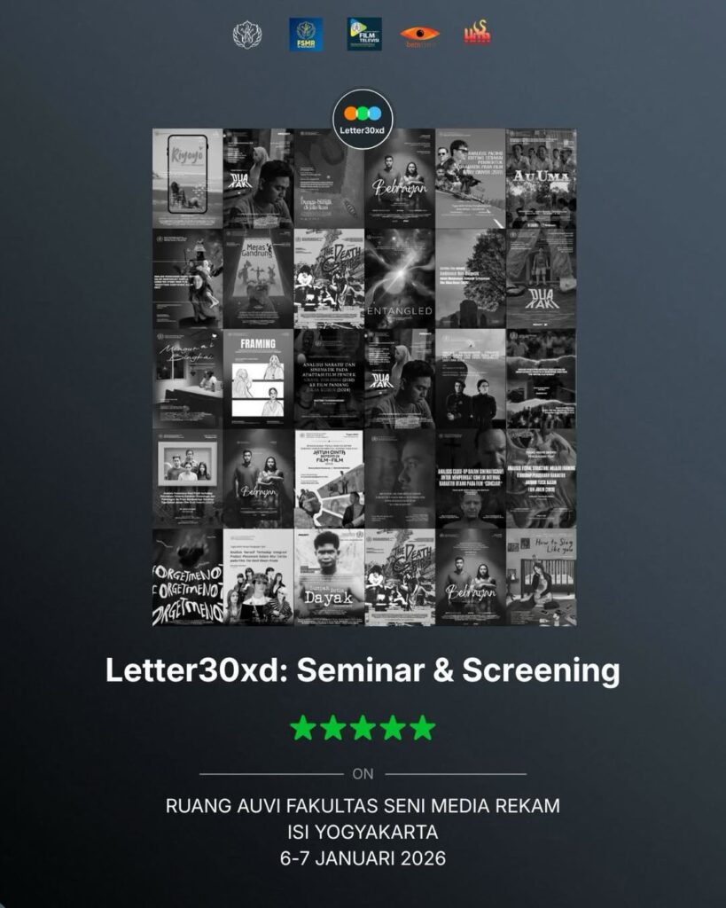 Letter30xd: Seminar & Screening diselenggarakan pada 6–7 Januari 2026 bertempat di Ruang Auvi, Fakultas Seni Media Rekam (FSMR) ISI Yogyakarta. Seluruh karya yang ditampilkan merupakan hasil proses akademik mahasiswa yang dipresentasikan sekaligus diputar untuk publik, sebagai bagian dari ekosistem pembelajaran berbasis praktik dan riset artistik.