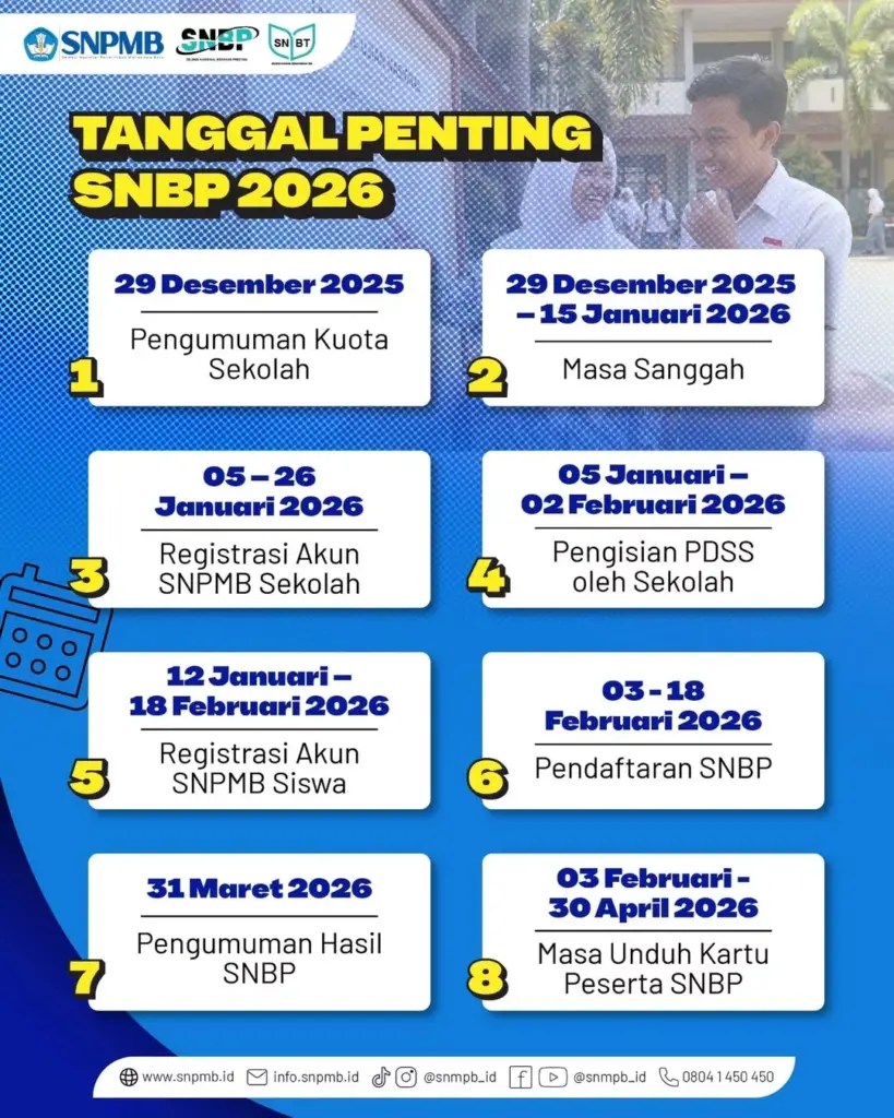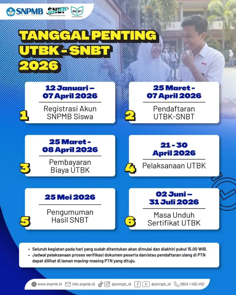 Yogyakarta, 5 Desember 2026 — Panitia Seleksi Nasional Penerimaan Mahasiswa Baru (SNPMB) secara resmi merilis rangkaian tanggal penting SNPMB Tahun 2026 yang menjadi acuan nasional bagi siswa, sekolah, dan pemangku kepentingan pendidikan dalam proses seleksi masuk perguruan tinggi negeri. Informasi tersebut mencakup jadwal Seleksi Nasional Berdasarkan Prestasi (SNBP) serta Ujian Tulis Berbasis Komputer–Seleksi Nasional Berdasarkan Tes (UTBK–SNBT).