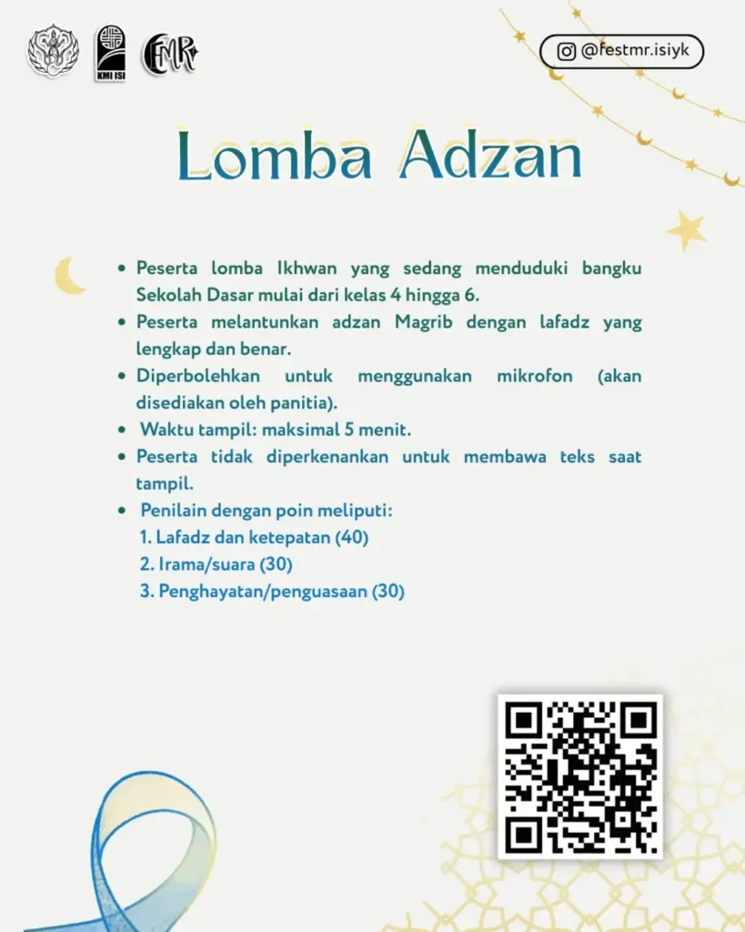 Yogyakarta, 22 Januari 2026 — Menyambut datangnya bulan suci Ramadan, Fakultas Seni Media Rekam (FSMR) Institut Seni Indonesia (ISI) Yogyakarta melalui rangkaian kegiatan bertema “Gema Cahaya Islami” menggelar kompetisi yang menjadi ruang ekspresi bakat, iman, dan kreativitas generasi muda. Kegiatan ini menghadirkan tiga cabang lomba, yakni MTQ, Adzan, dan Kaligrafi.