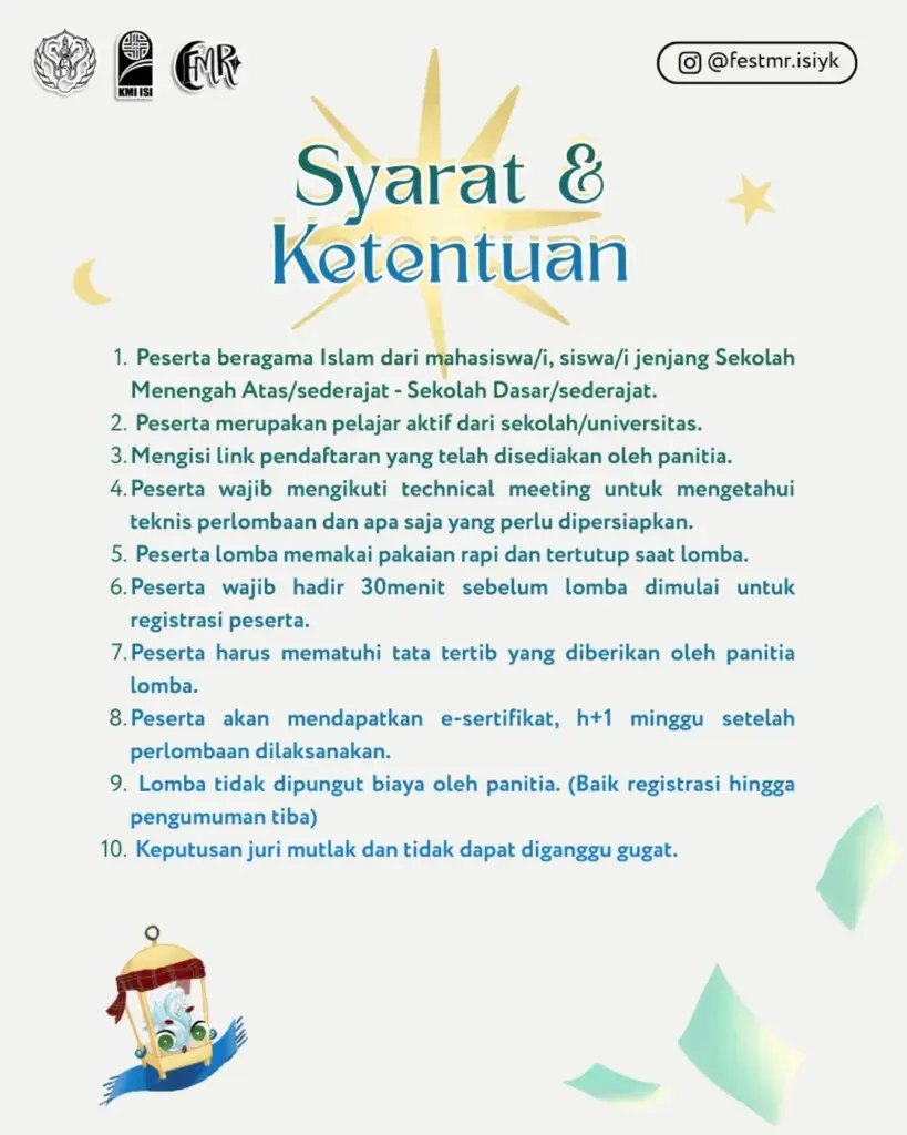 Dalam poster yang dirilis panitia, lomba ini terbuka bagi peserta beragama Islam dari kalangan mahasiswa/i serta pelajar berbagai jenjang. Peserta diwajibkan mengikuti technical meeting, menaati tata tertib, hadir sebelum lomba dimulai untuk registrasi, dan menggunakan pakaian yang rapi serta sopan. Panitia juga menyampaikan bahwa lomba ini tidak dipungut biaya serta peserta akan memperoleh e-sertifikat setelah kegiatan.