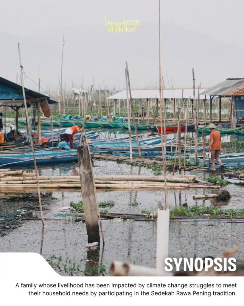 Dari sisi narasi, Bunga-Bunga di Jala Ikan (A Mixed Blessing) mengangkat isu dampak perubahan iklim terhadap kehidupan masyarakat akar rumput. Film ini menggambarkan perjuangan sebuah keluarga yang kondisi ekonominya semakin terdesak, sehingga harus bertahan hidup dengan memanfaatkan tradisi Sedekah Rawa Pening. Karya ini dikembangkan melalui program Shorts Up 2024, dengan pendekatan yang memadukan isu lingkungan dan ketahanan sosial masyarakat lokal.