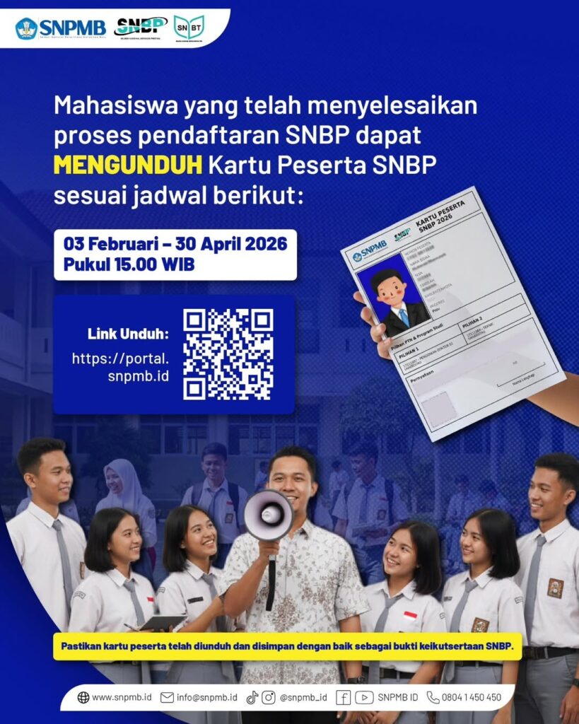 Seiring dibukanya pendaftaran, peserta yang telah menyelesaikan proses registrasi dapat mengunduh Kartu Peserta SNBP mulai 3 Februari hingga 30 April 2026 pukul 15.00 WIB melalui portal yang sama. Kartu peserta ini perlu disimpan dengan baik sebagai bukti keikutsertaan.