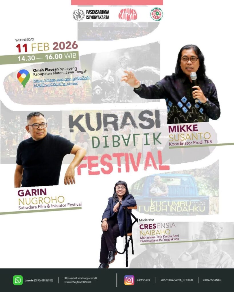Yogyakarta, 10 Februari 2026 — Pascasarjana Institut Seni Indonesia Yogyakarta terus menegaskan perannya sebagai pusat pengembangan pengetahuan dan praktik tata kelola seni melalui kegiatan Otaks Kanan #4 bertajuk “Kurasi di Balik Festival”. Forum ini dipersembahkan oleh mahasiswa Prodi Magister Tata Kelola Seni (TKS) Pascasarjana ISI Yogyakarta dan akan digelar Rabu, 11 Februari 2026, pukul 14.30–16.00 WIB di Omah Plaosan by Javena, Klaten.