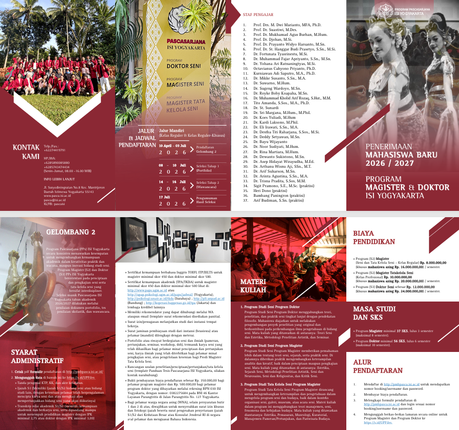 YOGYAKARTA, 28 April 2026 — Institut Seni Indonesia Yogyakarta kembali membuka Penerimaan Mahasiswa Baru Program Pascasarjana Tahun Akademik 2026/2027 Gelombang 2. Pendaftaran dibuka mulai 10 April hingga 3 Juli 2026 melalui jalur mandiri untuk Program Magister dan Doktor, baik kelas reguler maupun reguler-khusus pada bidang Tata Kelola Seni.