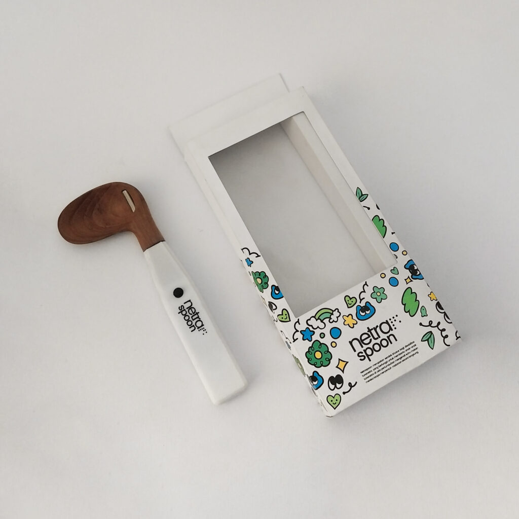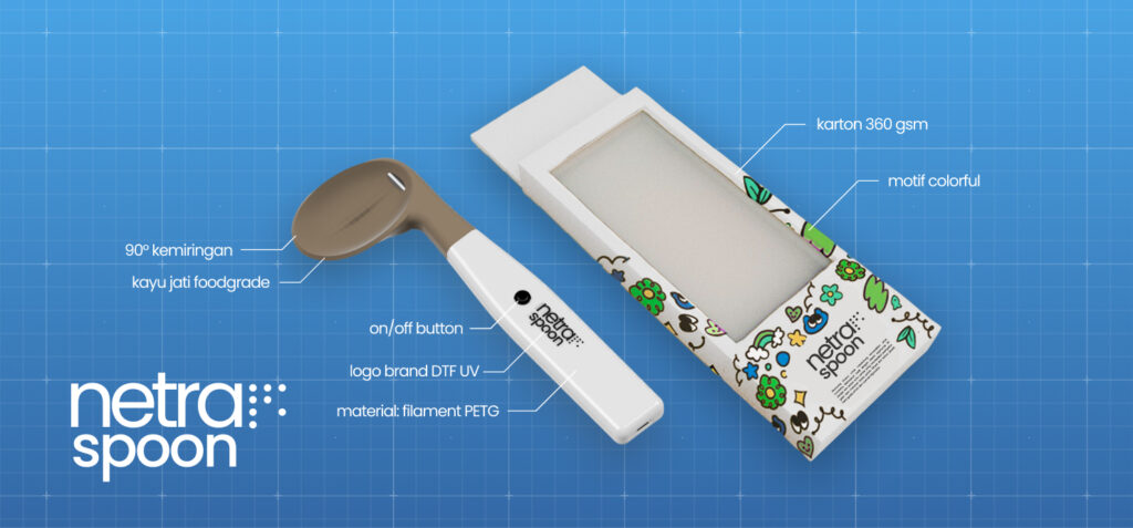 NetraSpoon is an ergonomic spoon designed specifically for visually impaired children. The tip of the spoon is made of food-grade teak wood in a 90° shape to be easily directed to the mouth, while the handle is made with 3D printing technology using PETG material that is sturdy and comfortable to hold. This innovation is equipped with a temperature sensor that detects the heat of the food and gives a subtle vibration to the handle, as a warning sign as well as a guide to the position of the food. This combination of technology and ergonomic design makes NetraSpoon a safe, functional and educational eating aid.