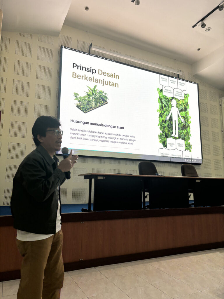 One of the sessions that attracted the most attention of the participants was the material presented by Mr. Adi Suro Triwibowo, who shared his experience of practicing the interior design profession and observing sustainable environmentally friendly interior projects. Through his presentation, he emphasized the importance of ecological awareness in every interior design process, from material selection, energy efficiency, to the sustainability of space functions.
