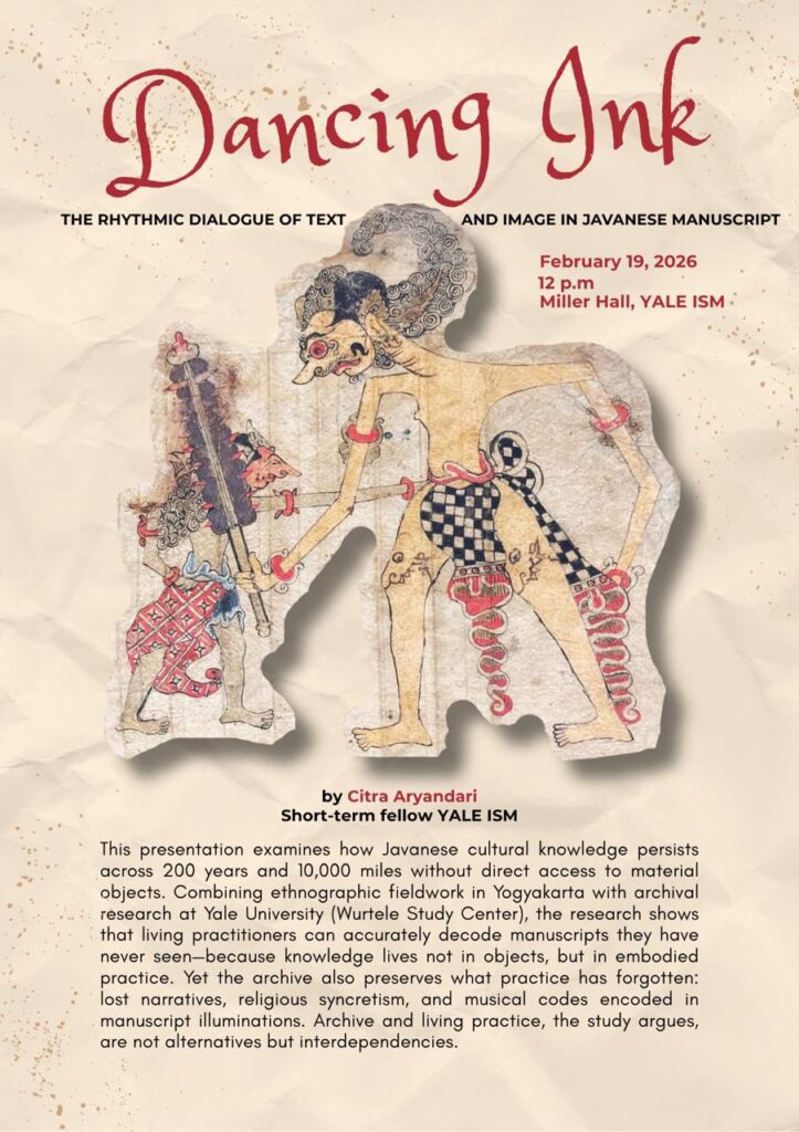 This research was presented on February 19, 2026 at Miller Hall, Yale ISM, in an academic forum entitled “Dancing Ink: The Rhythmic Dialogue of Text and Image in Javanese Manuscript.” At the same time, the video art essay research results are also screened as part of international academic dissemination.