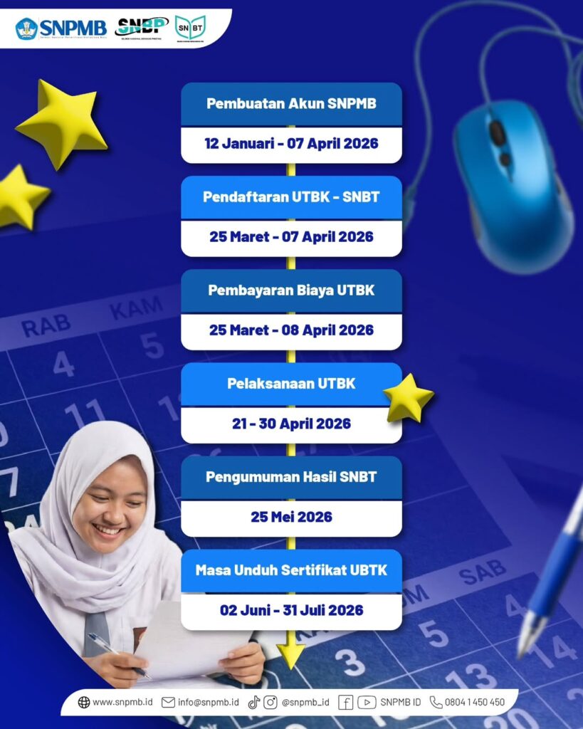 Based on the official SNPMB schedule, SNPMB account creation opens on January 12 to April 7, 2026. UTBK-SNBT registration takes place from March 25 to April 7, 2026, with UTBK fee payment from March 25 to April 8, 2026. UTBK implementation is scheduled for April 21-30, 2026, while the SNBT result announcement will be made on May 25, 2026. Participants who need UTBK certificates can download them from June 2 to July 31, 2026.