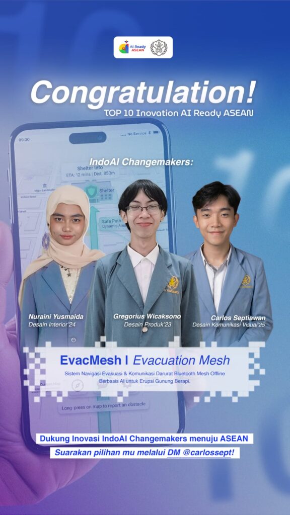 Yogyakarta, April 15, 2026 — Students from the Indonesian Institute of the Arts (ISI) Yogyakarta have once again achieved a proud accomplishment at the international level. In the AI Ready ASEAN Youth Challenge, organized by AI Singapore, a team of ISI Yogyakarta students successfully broke into the Top 10 in Indonesia with their innovation, Evacuation Mesh (EvacMesh), an emergency evacuation communication and navigation system based on artificial intelligence and offline Bluetooth mesh.